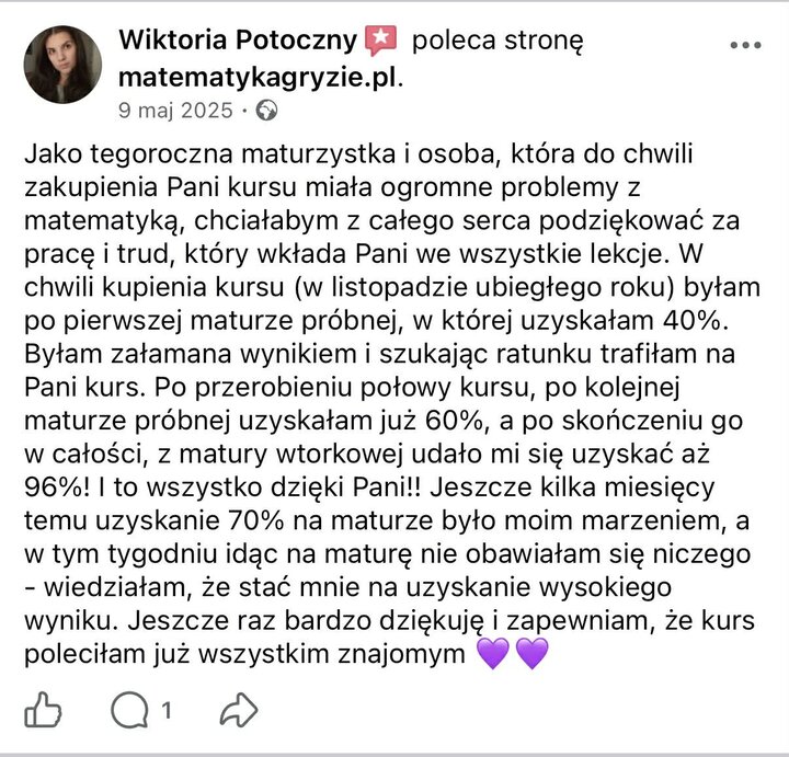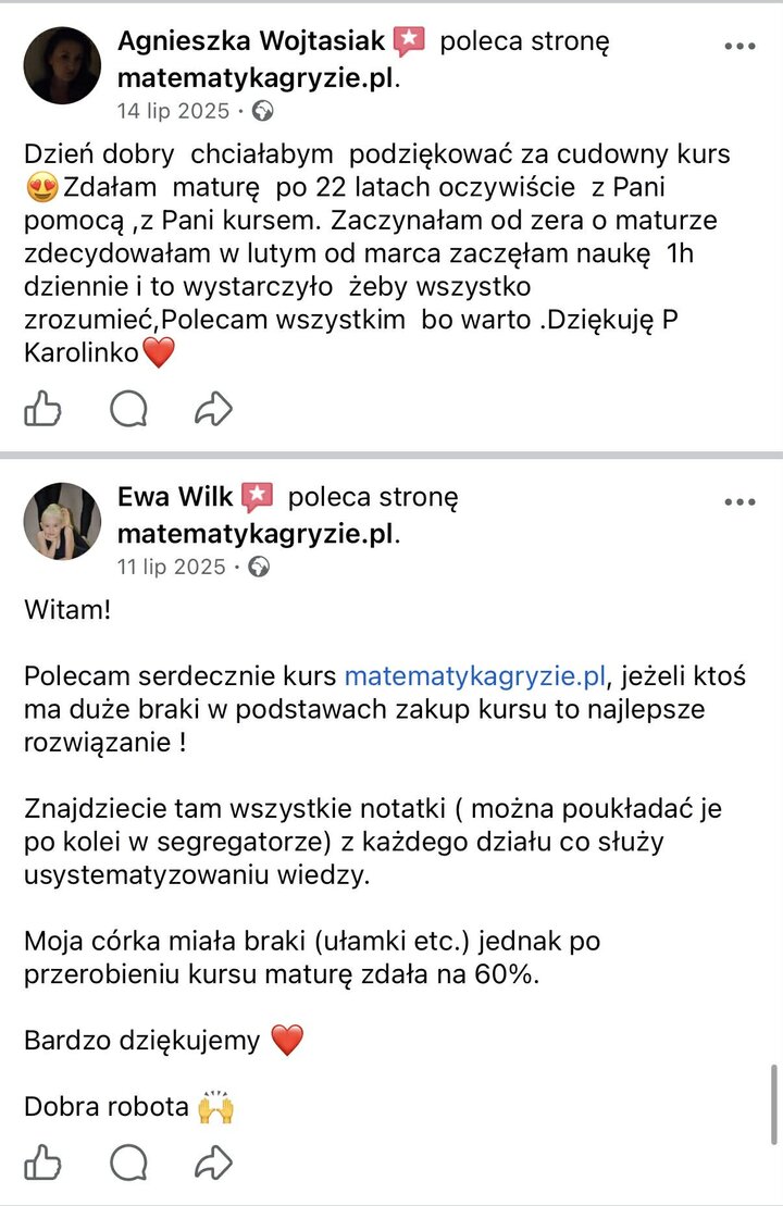 Aktualnie nie mam wolnych miejsc na lekcje indywidualne ale jak tylko pojawia się wolne miejsce dodaję wolne terminy poniżej na tej stronie oraz publikuje je na moich social mediach Matematyka Gryzie na Facebooku i Instagramie. Zachęcam do obserwacji moich social mediów oraz częstego wchodzenia na tą stronę. Terminy często się pojawiają, gdyż okazuje się, że mój kurs w zupełności wystarcza. :)