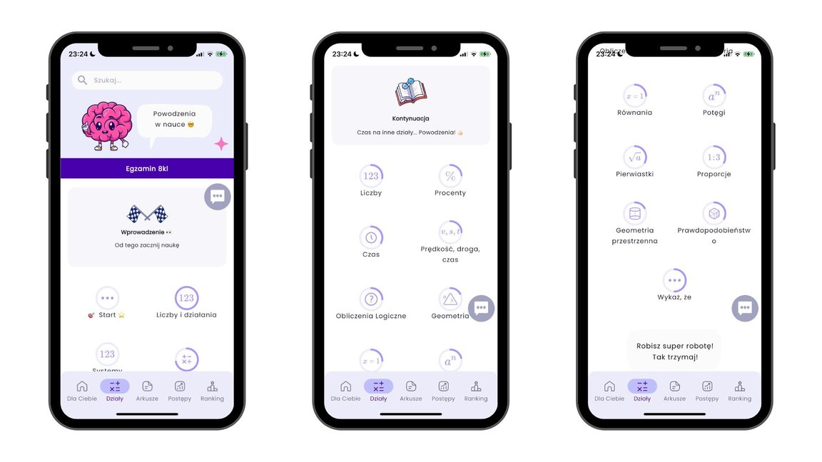 8. Po udanej płatności pobieramy aplikację Matma Gryzie na telefonie lub tablecie w AppStore lub Google Play lub logujemy się na app.matematykagryzie.pl (do kursu można logować się na różnych urządzeniach ale tylko na jednym jednocześnie)