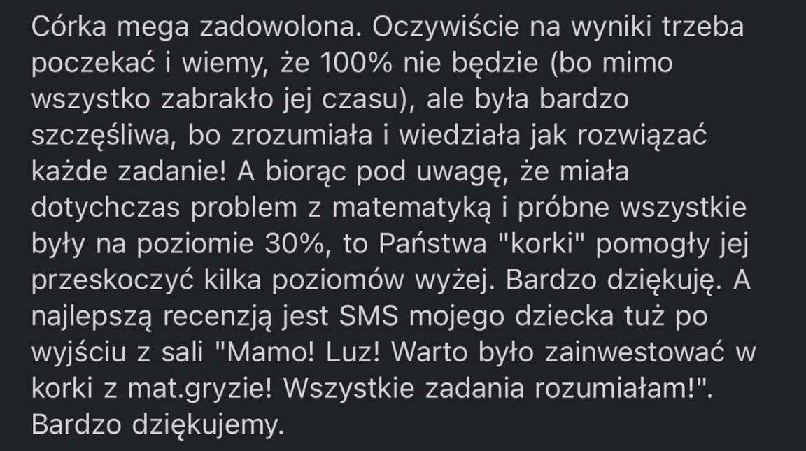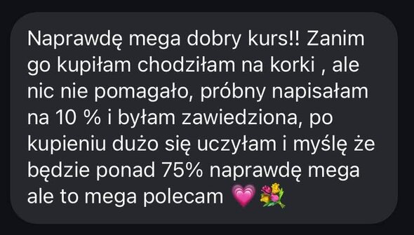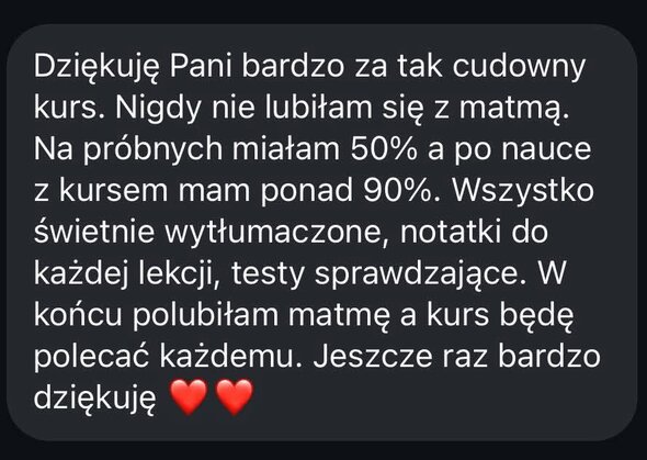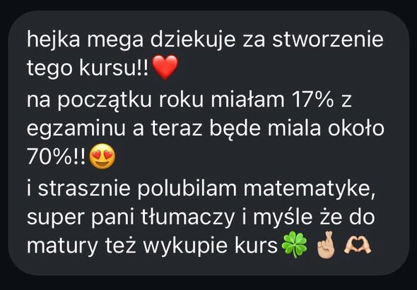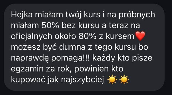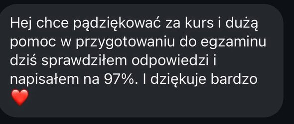 Uczniowie mają też stałe wsparcie, możliwość zadawania pytań oraz dostęp do materiałów tworzonych z myślą o tym, co naprawdę pojawia się na egzaminie – bez zbędnych treści, bez chaosu i frustracji. Kurs jest zaprojektowany tak, by uczeń mógł samodzielnie, we własnym tempie pracować nad tym, co sprawia mu trudność – i to działa. Widzimy to po opiniach rodziców i wynikach naszych kursantów.