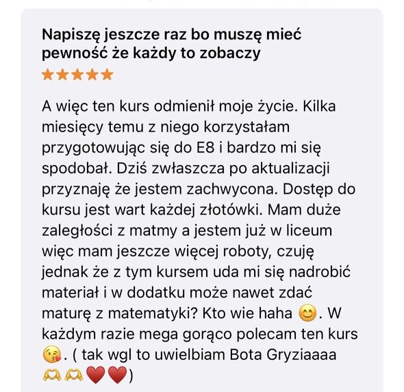 Tak na http://gryzie.pl/ powstał pomysł na kurs zastępujący korepetycje, uczący od zera w krótkim czasie. Ponad 1700 pozytywnych opinii uczniów to dla mnie ogromna radość i dowód, że wraz z moim zespołem osiągnęliśmy sukces, pomagając tysiącom uczniów co roku.