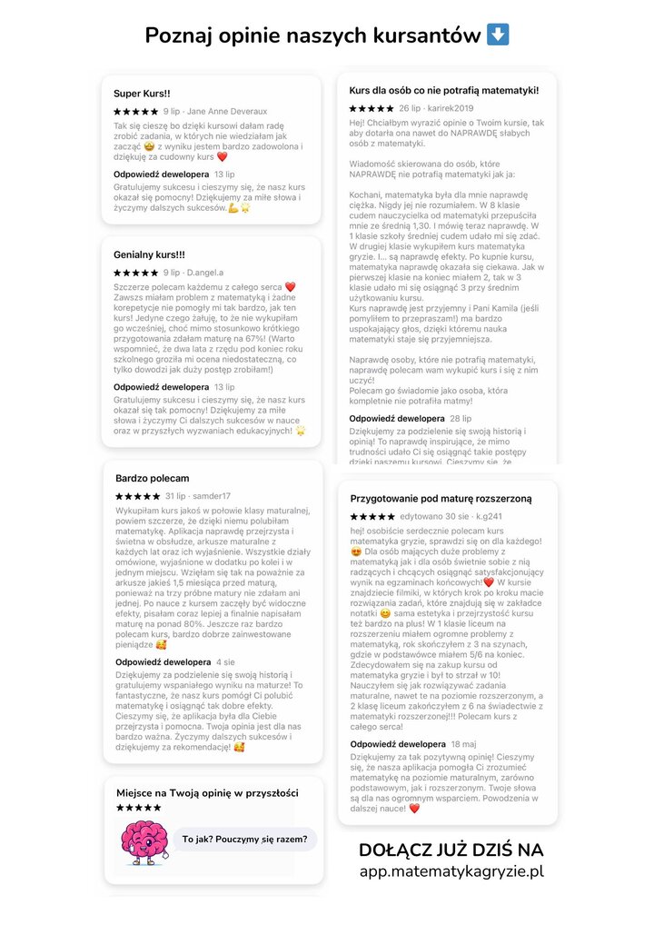 Dołącz do tysięcy zadowolonych uczniów Matematyka Gryzie i przekonaj się, że matematykę da się zrozumieć, polubić i opanować na najwyższym poziomie! Twoja matematyczna podróż do sukcesu zaczyna się tutaj.